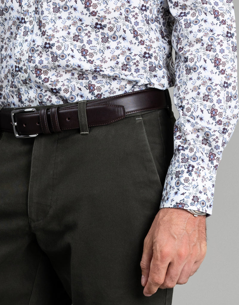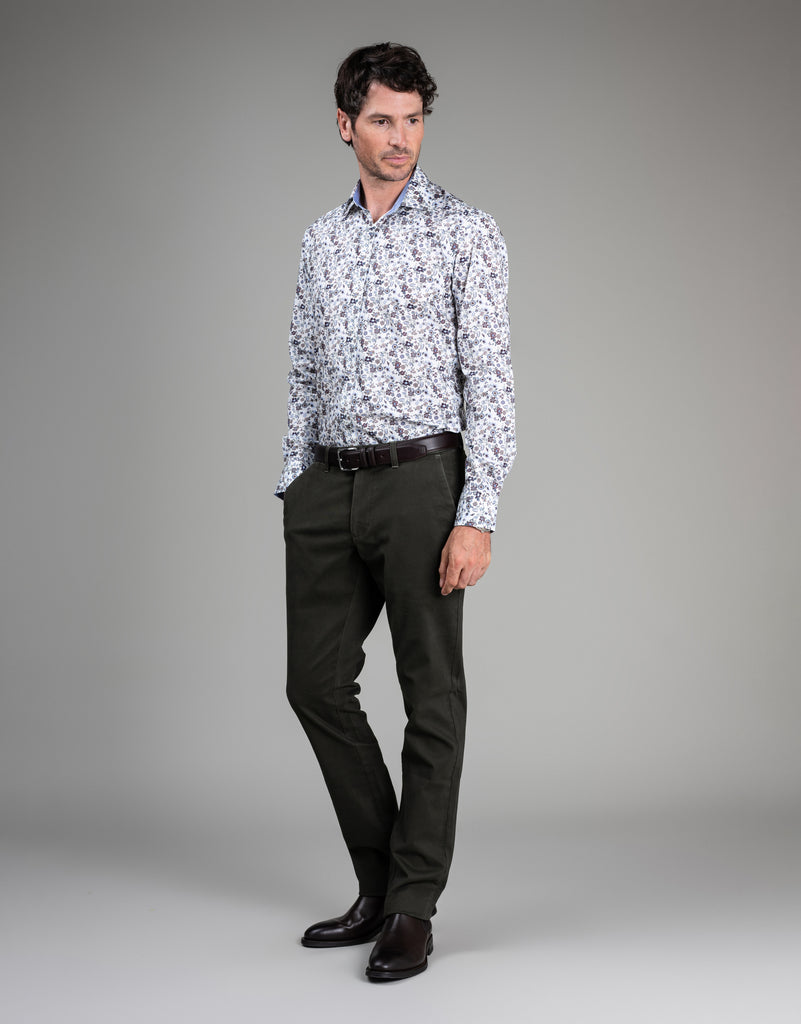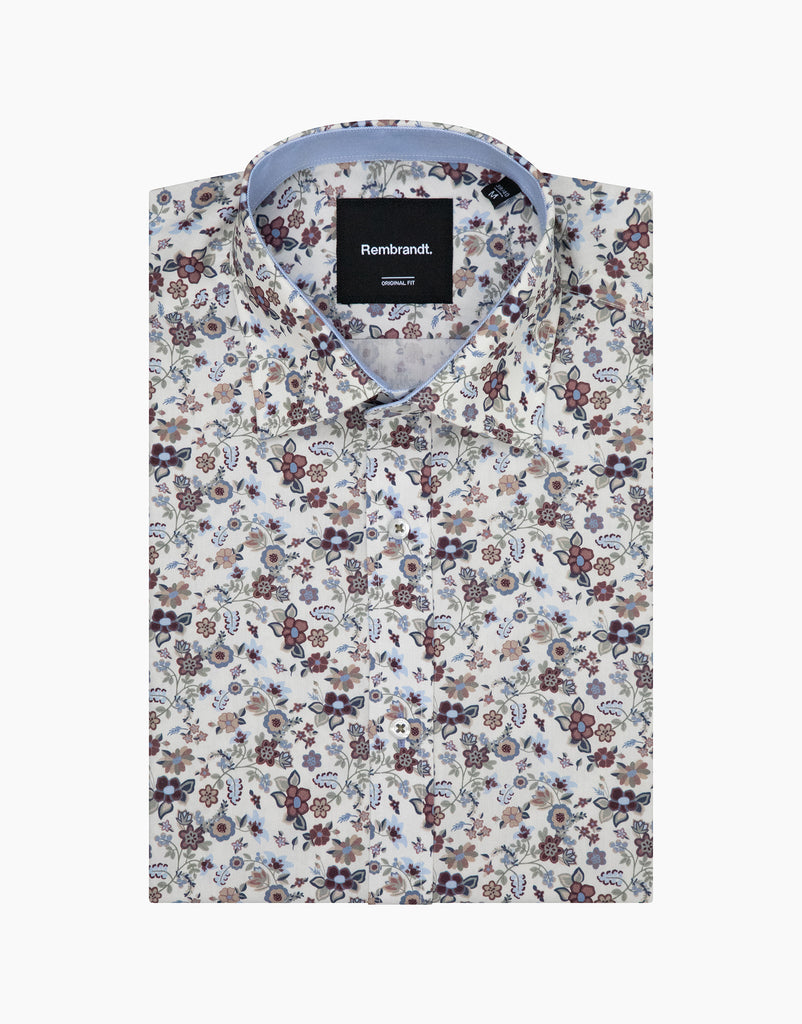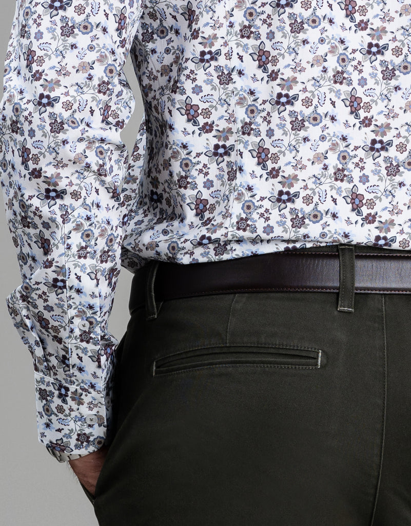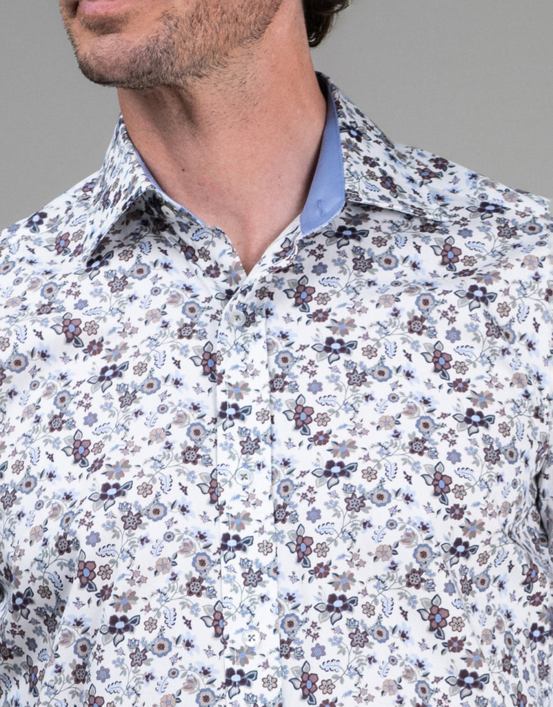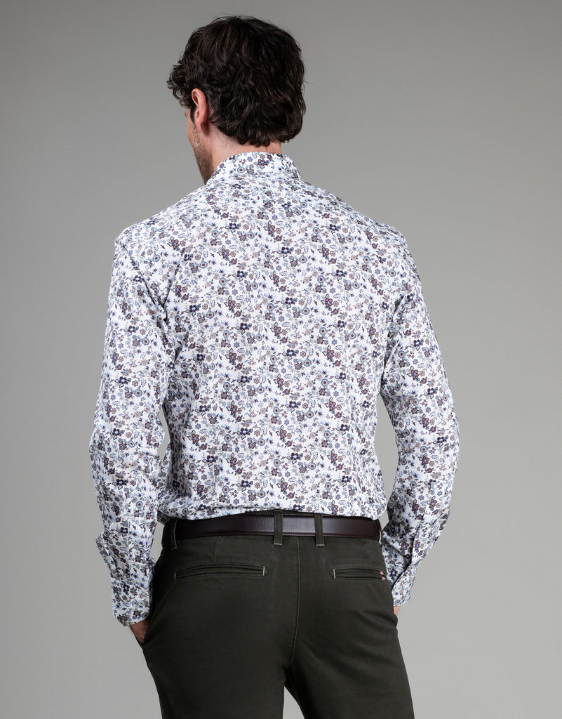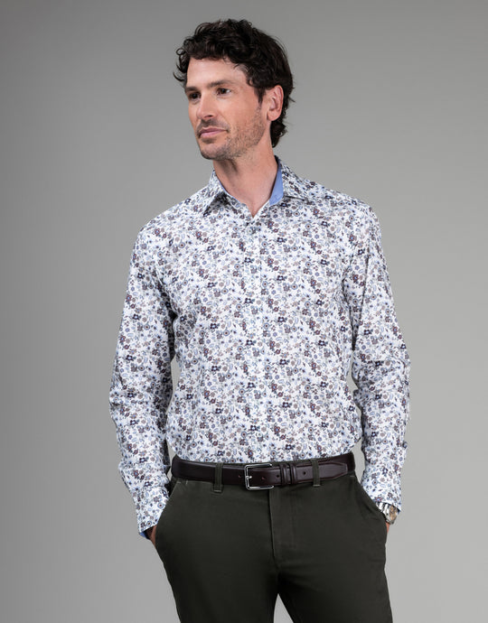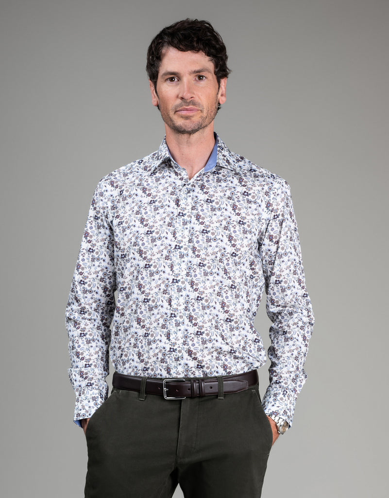 Delicate botanical illustrations bloom across crisp white cotton in this versatile smart casual shirt. Soft mauve, beige, powder blue, and sage accents create a refined garden aesthetic that transitions effortlessly from office to weekend wear. The balanced cut drapes naturally across the shoulders and chest without clinging, while contrast detailing at the cuffs, collar, and buttonholes adds understated sophistication. Crafted from pure cotton for breathable comfort. Available in Regular, Short (4cm shorter), and Tall (4cm longer) proportions to ensure an ideal fit for your frame.