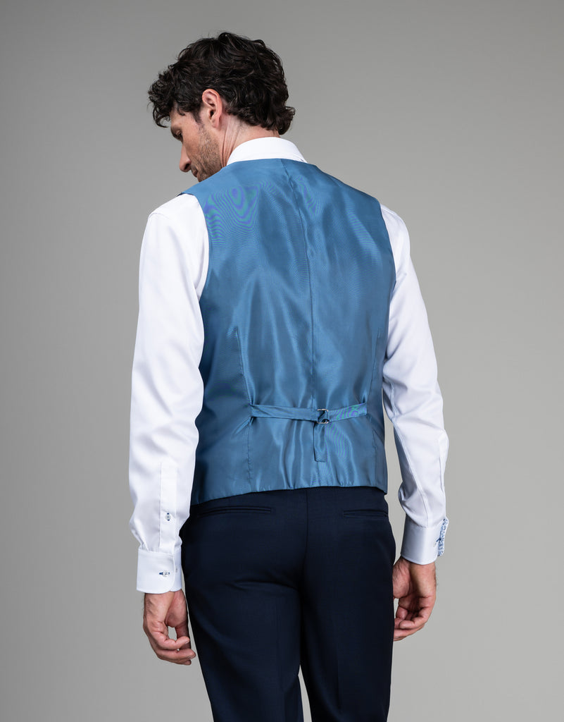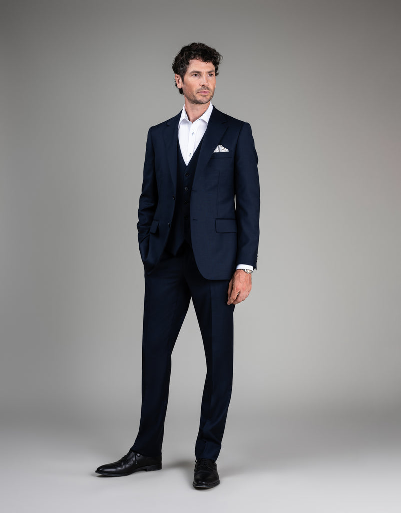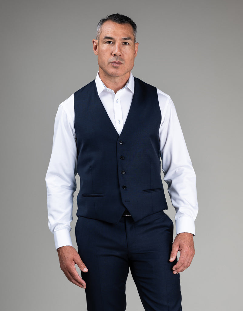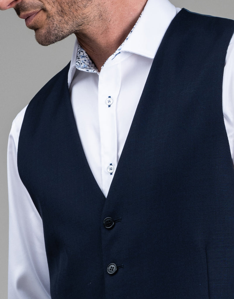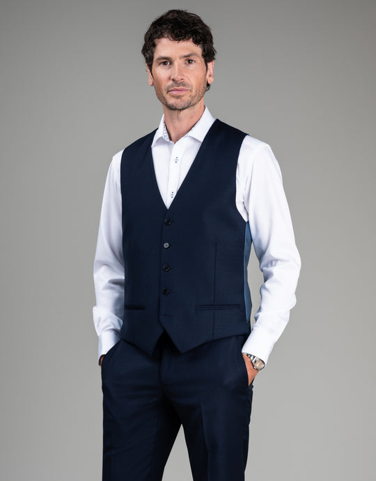 The Churchill Navy Waistcoat adds depth and formality to your look. Made from 100% merino wool and finished with a traditional five-button front, it pairs effortlessly with the Cooper Jacket and Lotus Trouser for a complete, coordinated three-piece suit.