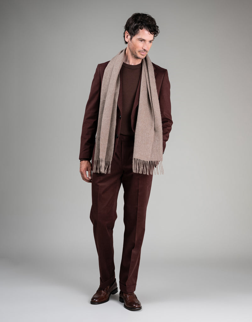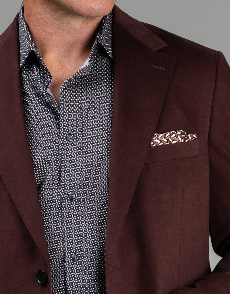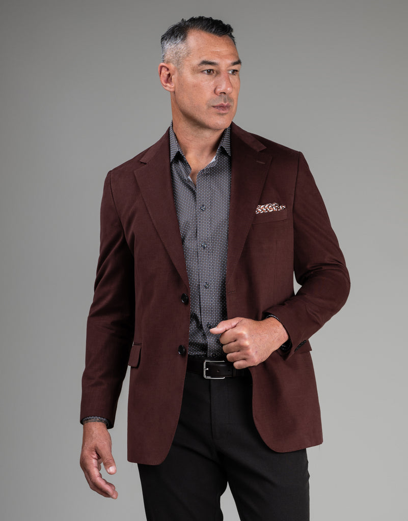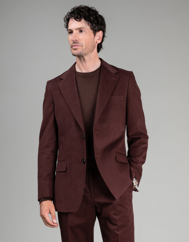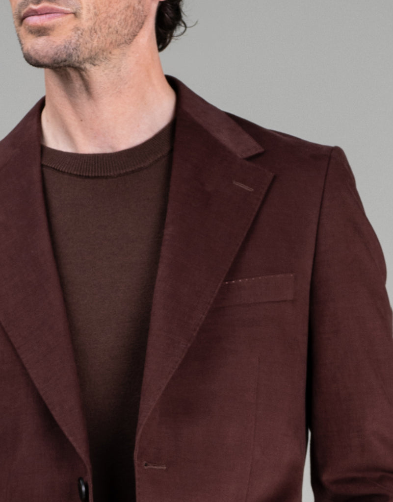 Crafted from a luxurious cotton-cashmere blend woven by Tessuti Di Sondrio in Italy's Valtellina region, this blazer combines everyday wearability with refined elegance. The brushed finish delivers a wonderfully soft touch, while the sophisticated maroon hue works beautifully across seasons. Designed with a single-breasted silhouette, two-button front, and wide notch lapels, it features thoughtful details including pic-stitching, flap pockets, and a soft shoulder construction. The lightweight chest canvas and full lining ensure a polished drape and lasting comfort. Complete the look by pairing with the matching Evans Maroon Cotton-Cashmere Trouser for a coordinated two-piece suit.