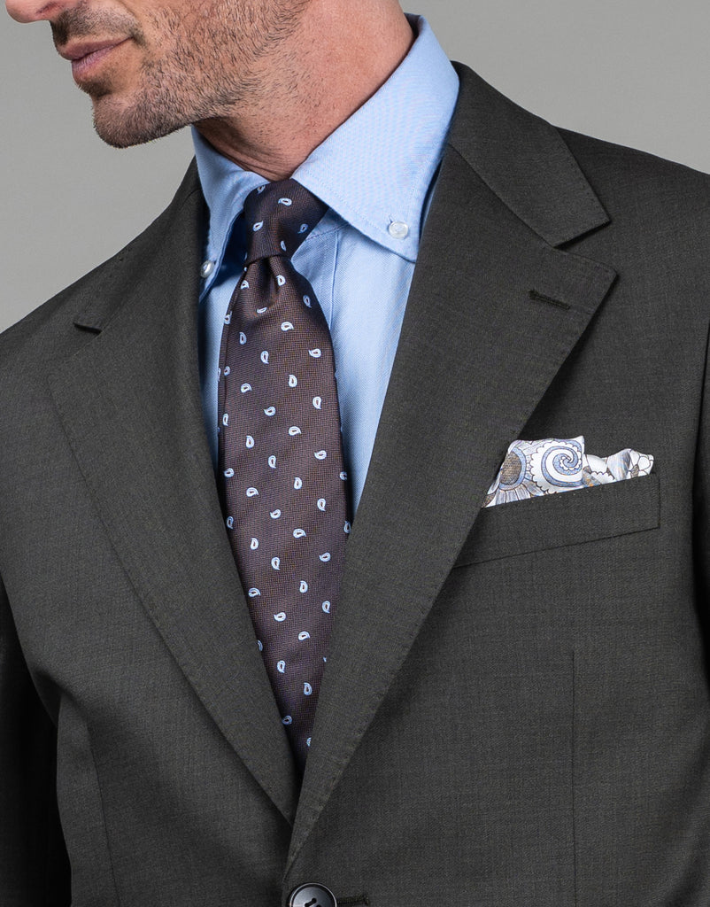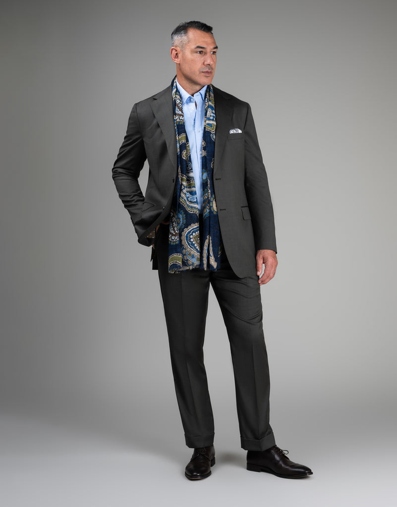 This relaxed-fit jacket channels understated elegance through its earthy olive-green twill, enriched with warm brown undertones that create subtle visual interest. Drawing from Italian tailoring traditions, the Cyprus silhouette eschews shoulder padding in favour of a naturally draped, contemporary aesthetic. The cut sits generously through the chest and shoulders before narrowing gracefully at the waist, finished with an extended hemline for modern proportion. Single-breasted two-button closure, wide notch lapels, and functional flap pockets complete the design, while pic-stitching detailing and full lining add refined touches. For a more tailored fit, size down one.