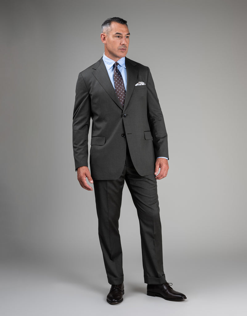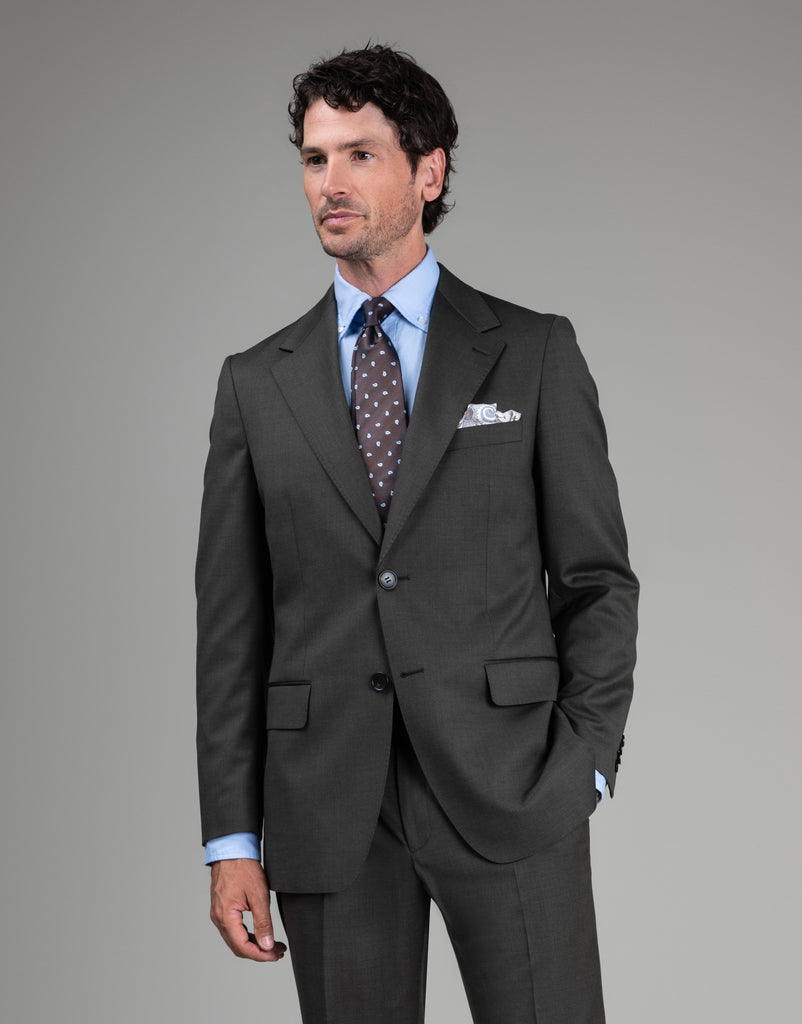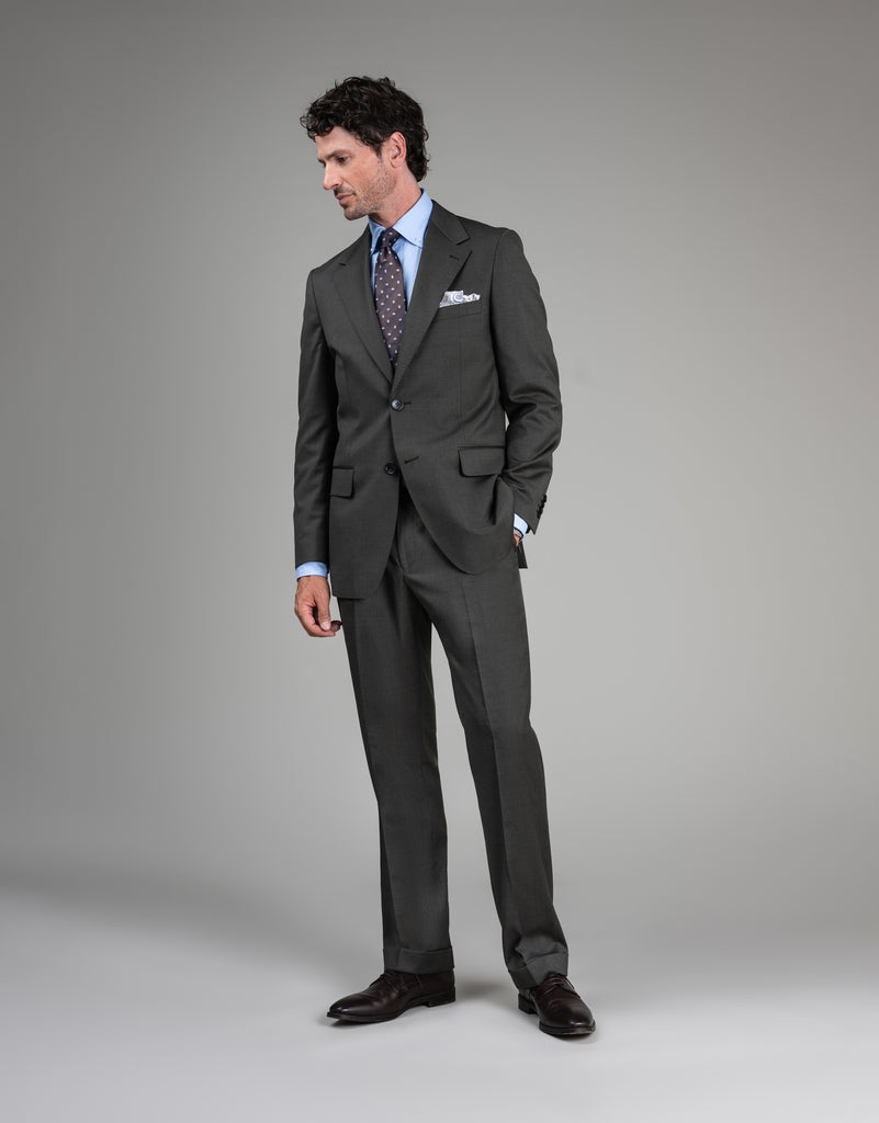 Tailored from premium Super 100's pure wool, this suit showcases an elegant olive green twill with subtle warm brown notes that enhance its sophisticated character. The relaxed fit provides modern ease while maintaining refined structure. As separates, the jacket and trousers can be paired independently, offering flexibility to achieve your preferred silhouette and extend your styling options.