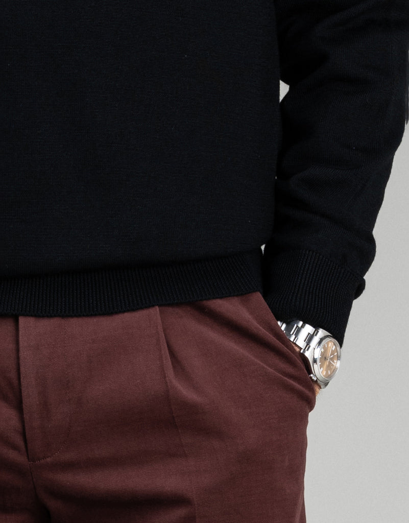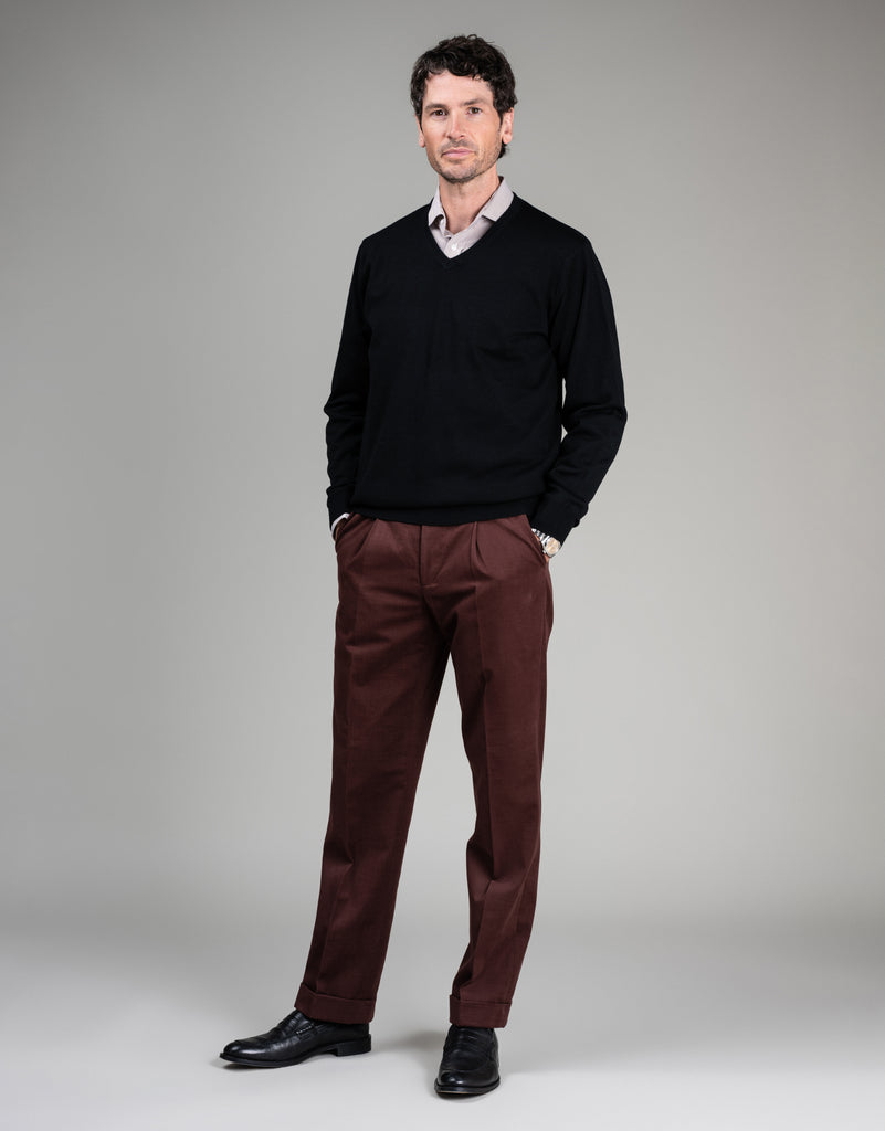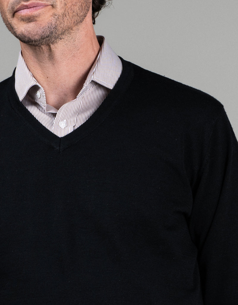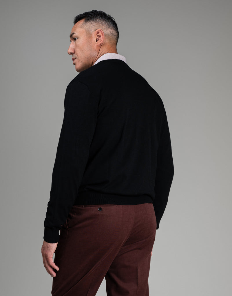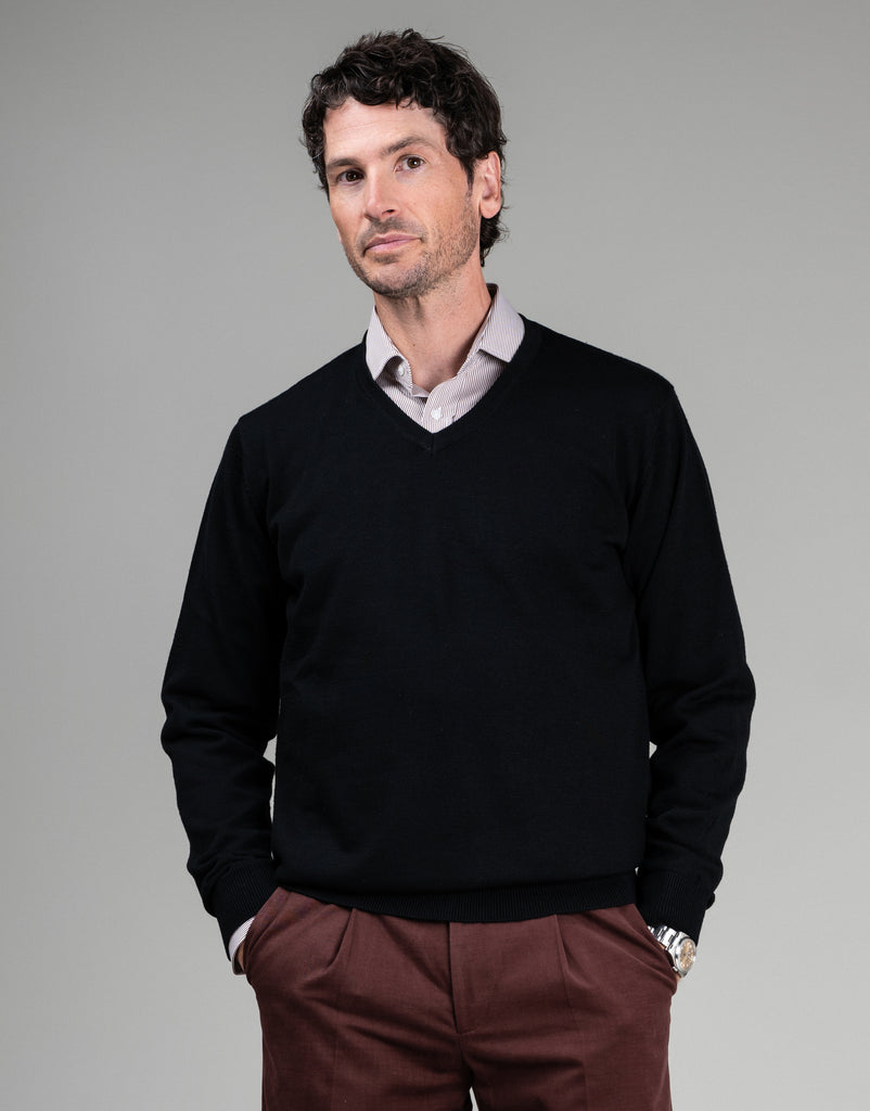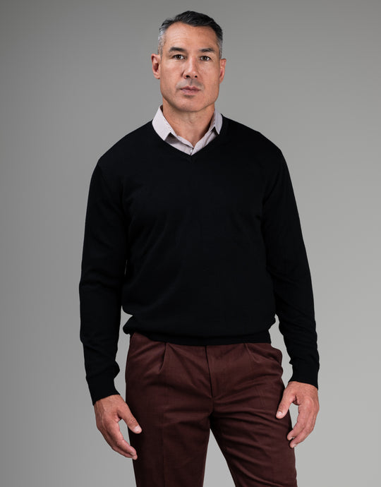Crafted from 100% pure merino wool, this black Fairlie v-neck is designed with double-ply yarns to maintain its shape and prevent pilling. Stay cozy, comfortable, and stylish with this perfect layering piece.