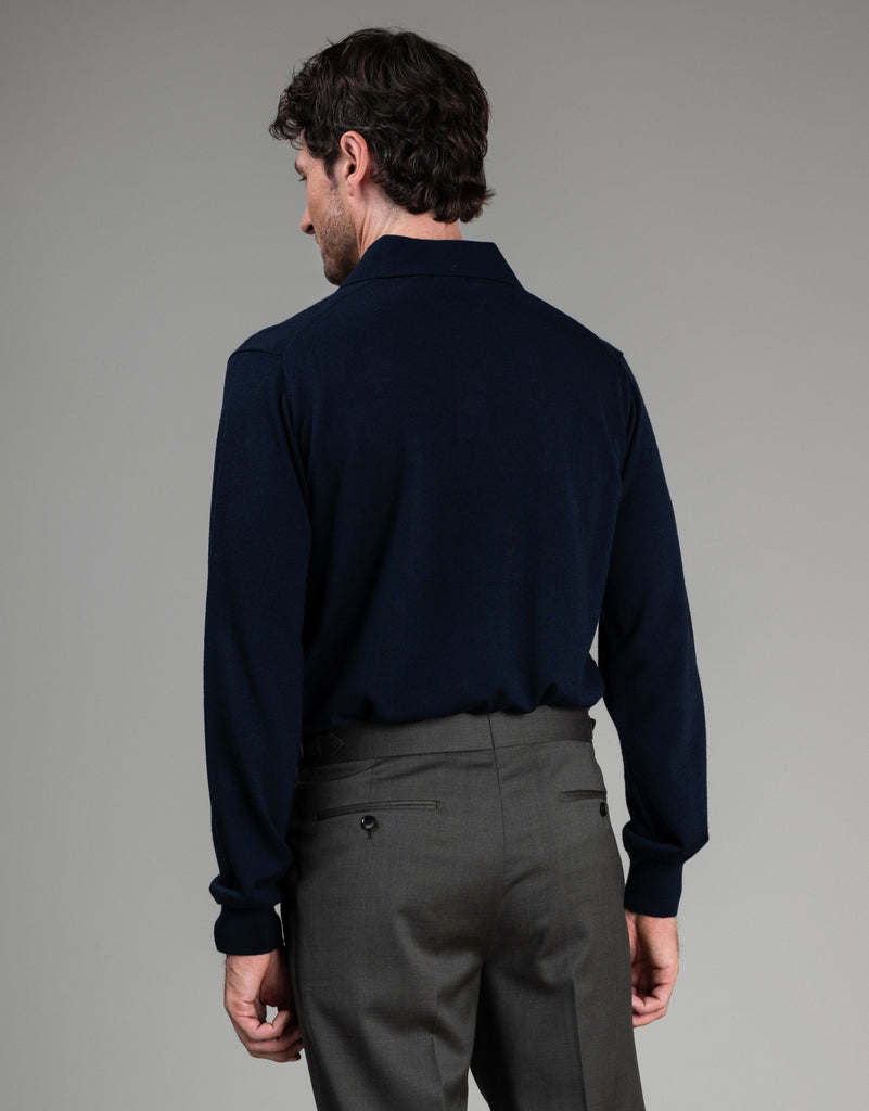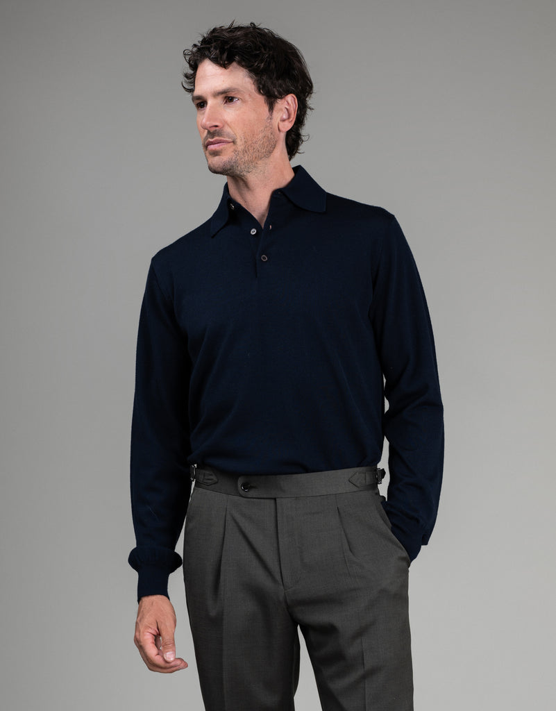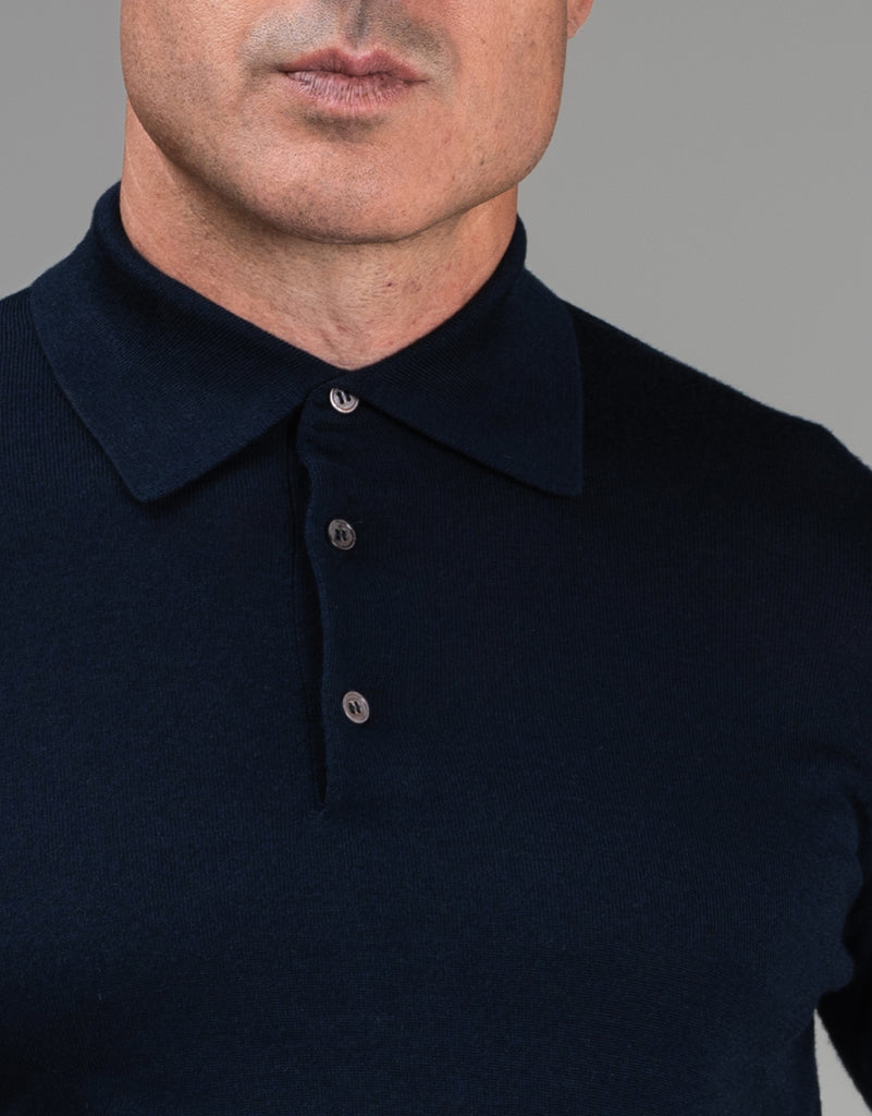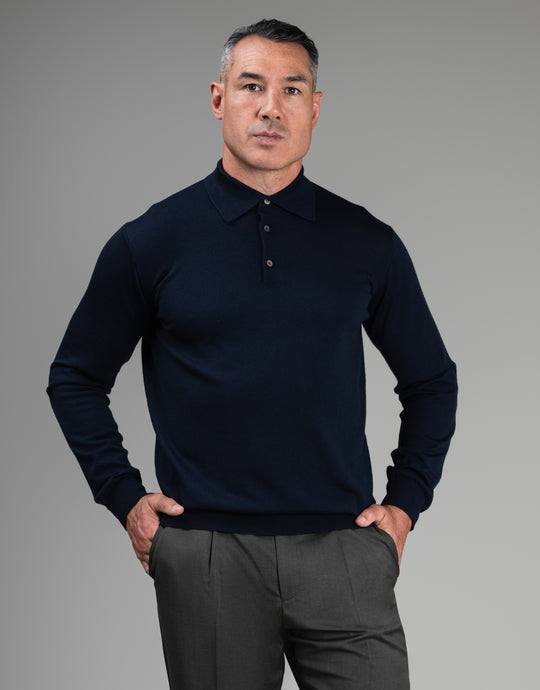 Introducing the Haast Navy Polo—a thoughtfully refined take on classic menswear. Built from soft extra-fine merino wool, this lightweight jersey offers exceptional comfort against the skin without sacrificing durability. The streamlined three-button design transitions effortlessly from layered sophistication under a blazer to standalone wear during shoulder seasons. Its inherent breathability and temperature-regulating properties make it an intelligent choice for the discerning wardrobe. A timeless piece that embodies understated elegance and practical versatility.