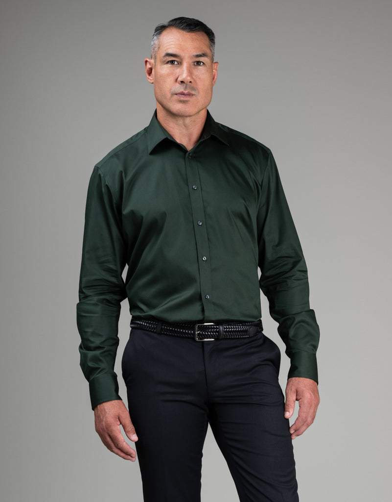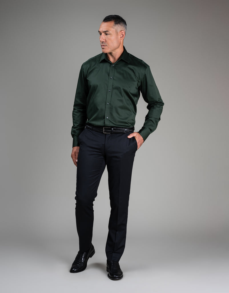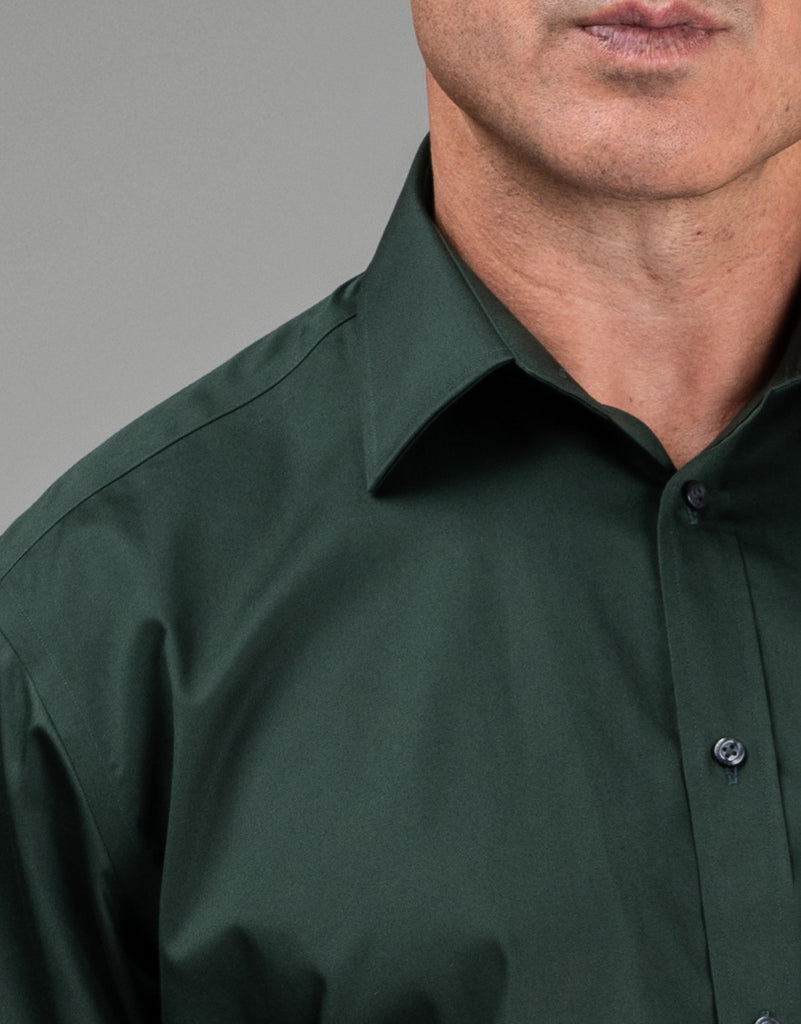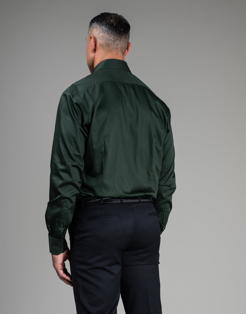 This London shirt showcases premium dark forest green sateen with a refined lustrous finish. Featuring a semi-spread collar and convertible barrel cuffs for versatile wear, the garment incorporates strategic back darts and proportioned length for a clean tuck and polished drape. The result is a subtly tapered silhouette that combines comfort with a sophisticated, well-defined aesthetic.