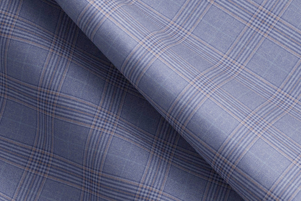 This light blue with brown Prince-of-Wales check made to measure jacket, is tailored using a luxury blend of merino wool, linen, and silk from Reda's Wool Silk Linen Jacket collection. This fabric exudes boldness and personality and aims to satisfy every style requirement.
