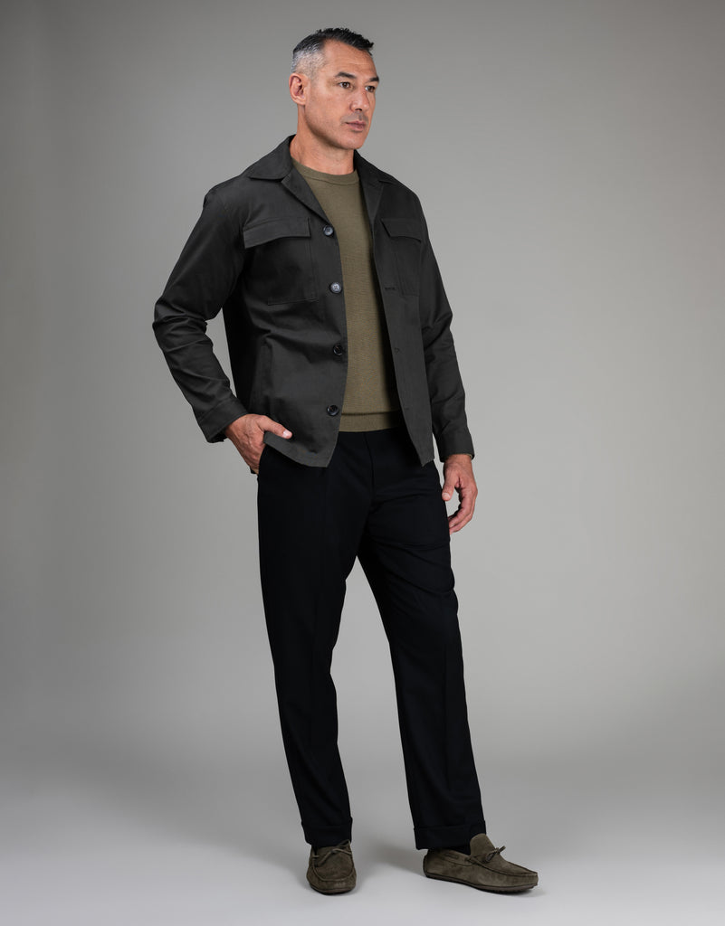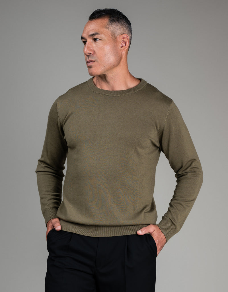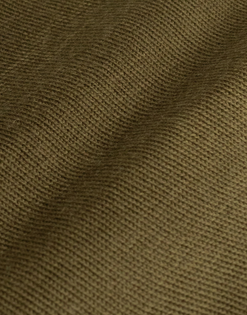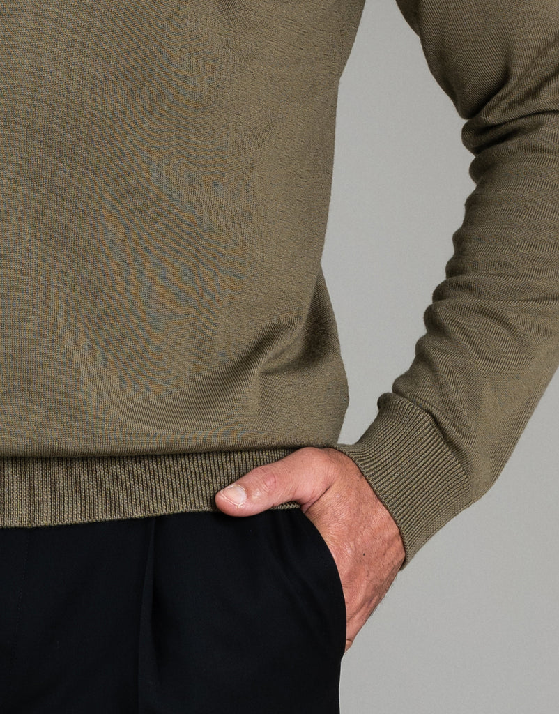 Crafted from pure merino wool, this crewneck jersey offers understated elegance in a sophisticated olive green hue. The mid-weight knit provides gentle warmth and breathability, making it an effortless layering piece for any season. Soft against the skin and naturally versatile, the Naseby jersey transitions seamlessly from casual to refined styling.