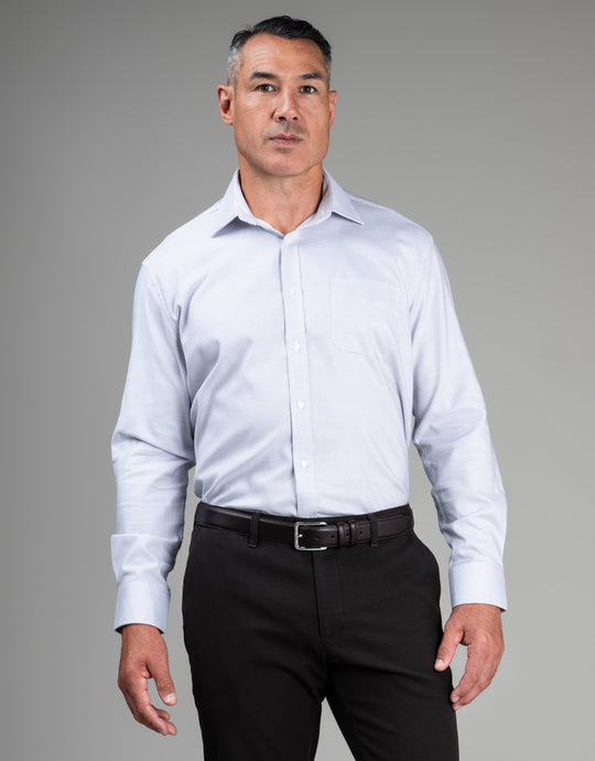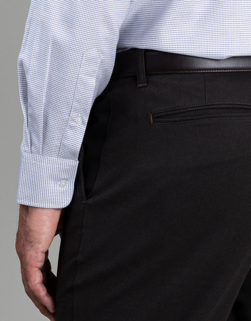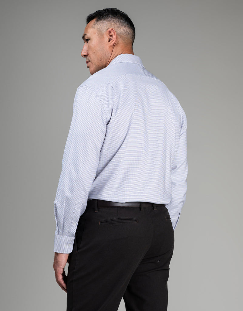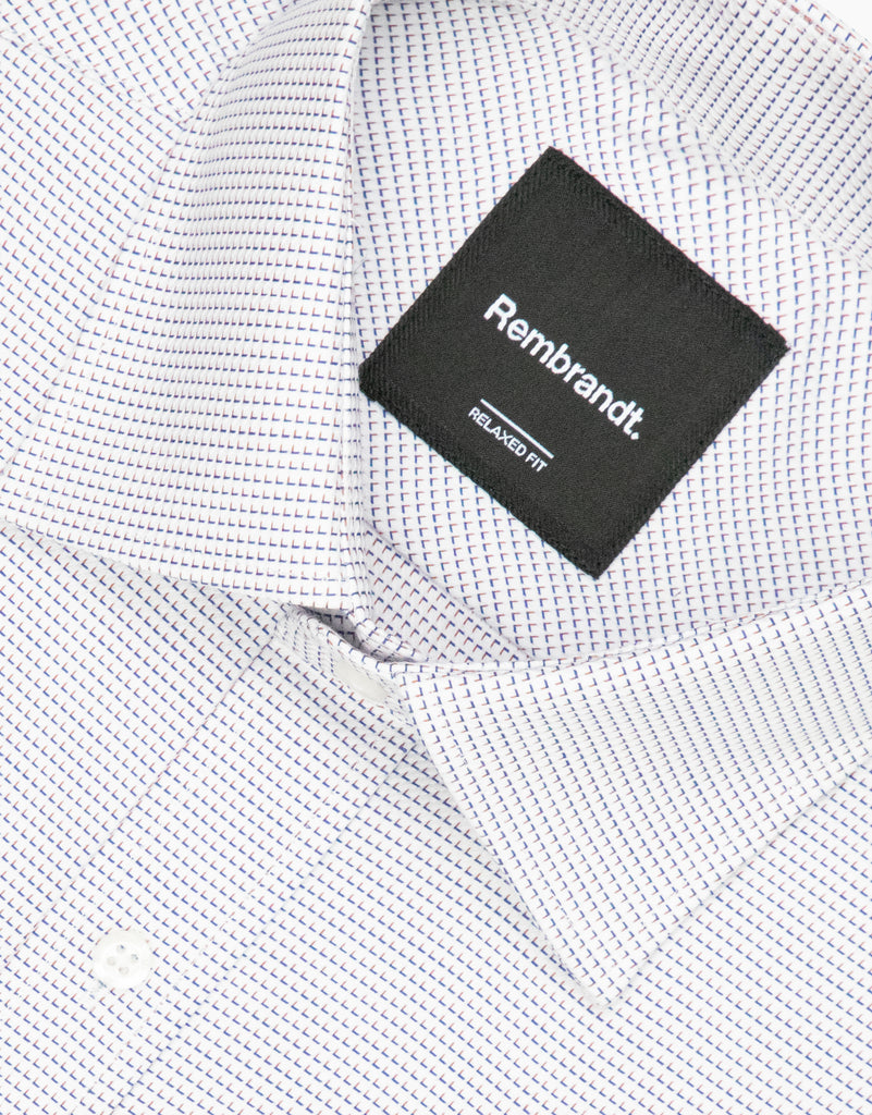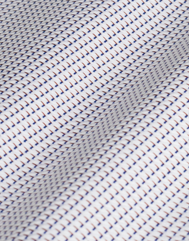 This shirt seamlessly merges comfort with understated sophistication. The crisp white canvas is punctuated by subtle blue and caramel brown micro-details, enhanced by a fine diagonal herringbone texture that catches the light with quiet elegance. Generously proportioned through the chest, waist, and sleeves, it encourages unrestricted movement while its tailored construction preserves a polished aesthetic. The cotton-elastane composition provides responsive stretch for all-day wearability, complemented by practical barrel cuffs and a front pocket.
